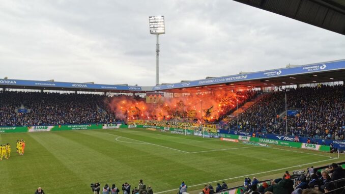 Bochum. Zum Anpfiff des kleinen Revierderbys zwischen dem VfL Bochum und Borussia Dortmund fackelten die BVB-Anhänger massiv Pyrotechnik ab.